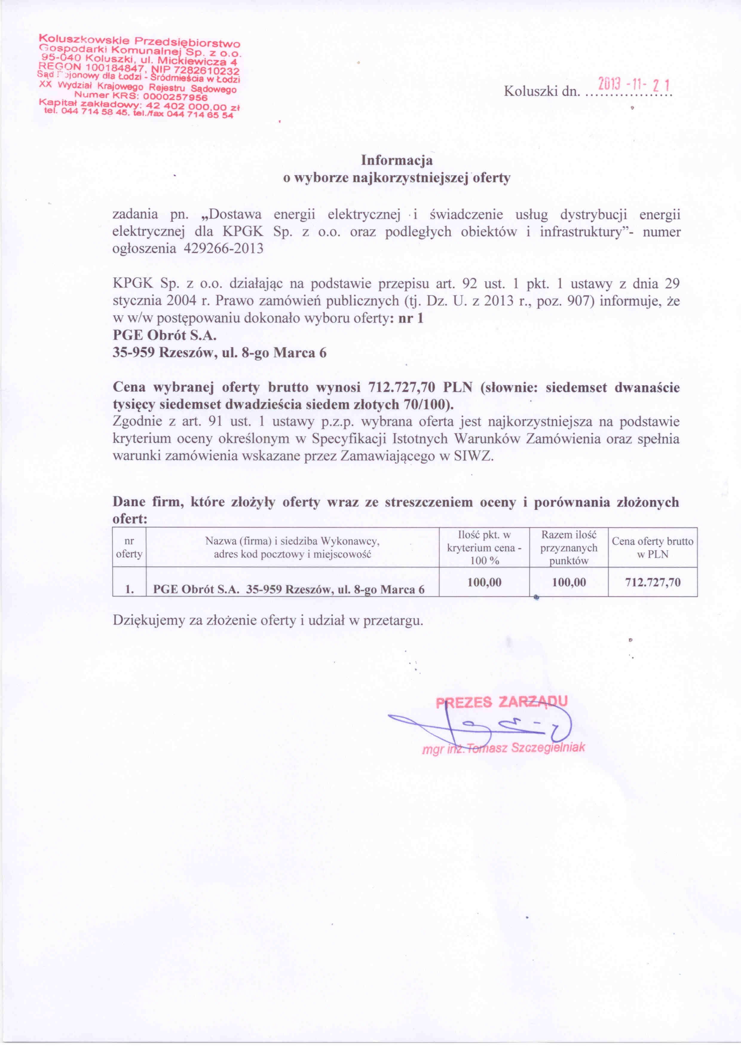 III.6) INNE DOKUMENTY Inne dokumenty niewymienione w pkt III.4) albo w pkt III.5) zgodnie z siwz SEKCJA IV: PROCEDURA IV.1) TRYB UDZIELENIA ZAM脫WIENIA IV.1.1) Tryb udzielenia zam贸wienia: przetarg nieograniczony. IV.2) KRYTERIA OCENY OFERT IV.2.1) Kryteria oceny ofert: najni偶sza cena. IV.3) ZMIANA UMOWY przewiduje si臋 istotne zmiany postanowie艅 zawartej umowy w stosunku do tre艣ci oferty, na podstawie kt贸rej dokonano wyboru wykonawcy: Dopuszczalne zmiany postanowie艅 umowy oraz okre艣lenie warunk贸w zmian Zamawiaj膮cy zastrzega zmiany tre艣ci umowy w odniesieniu do zakresu przedmiotu zam贸wienia, tj. zmiany prognozowanej wielko艣ci zu偶ycia energii elektrycznej, wynikaj膮cej m.in. ze zmiany (zmniejszenia lub zwi臋kszenia) ilo艣ci miejsc dostarczania energii elektrycznej (przy艂膮czy, punkt贸w poboru), dostaw i przesy艂u energii do innych obiekt贸w niewskazanych w Za艂膮czniku do umowy lub w sytuacji zwi臋kszenia dostaw wraz z przesy艂em energii do obiektu w zwi膮zku z dokonan膮 rozbudow膮, przebudow膮 obiektu itd. Zmiany, o kt贸rych mowa powy偶ej dokonywane s膮 na podstawie aneksu do umowy. Zamawiaj膮cy zastrzega r贸wnie偶 mo偶liwo艣膰 zmiany tre艣ci umowy dot. ceny za dystrybucj臋 energii w przypadku zmiany taryfy dystrybucji Operatora Systemu Dystrybucyjnego zatwierdzonej przez Prezesa Urz臋du Regulacji Energetyki, z zastrze偶eniem obowi膮zywania w ca艂ym okresie obowi膮zywania umowy podanej w ofercie Wykonawcy wielko艣ci 100 % ceny taryfowej zastosowanej do obliczenia ceny przesy艂u energii. Zmiana cen dokonana przez odpowiedni organ (dostawy i przesy艂u) nie wymaga zmiany umowy. Zamawiaj膮cy dopuszcza tak偶e zmiany tre艣ci umowy w przypadku okoliczno艣ci, kt贸rych nie mo偶na przewidzie膰 na etapie wszcz臋cia post臋powania m.in. zwi膮zanych z procedurami, zmianami organizacyjnymi i uwarunkowaniami wewn臋trznymi Zamawiaj膮cego np. zaprzestanie dostaw i przesy艂u energii do jednego lub kilku obiekt贸w wskazanych w Za艂膮czniku ze wzgl臋du np. na wy艂膮czenie obiektu z eksploatacji. Zamawiaj膮cy zastrzega zmiany tre艣ci umowy w przypadkach, gdy zaistnieje istotna zmiana okoliczno艣ci powoduj膮ca, 偶e wykonanie umowy w dotychczasowym brzmieniu nie le偶y w interesie publicznym, czego nie mo偶na by艂o przewidzie膰 w chwili zawarcia umowy. Zamawiaj膮cy przewiduje mo偶liwo艣膰 zmiany postanowie艅 umowy w stosunku do tre艣ci oferty w przypadkach, gdy: a) nast膮pi zmiana powszechnie obowi膮zuj膮cych przepis贸w prawa w zakresie maj膮cym wp艂yw na realizacj臋 przedmiotu zam贸wienia, b) nast膮pi zmiana przepis贸w prawa w zakresie podatku od towar贸w i us艂ug lub podatku akcyzowego w zakresie przedmiotu umowy prowadz膮ca do podwy偶szenia ca艂kowitego wynagrodzenia za realizacj臋 przedmiotu umowy. IV.4) INFORMACJE ADMINISTRACYJNE IV.4.1)聽Adres strony internetowej, na kt贸rej jest dost臋pna specyfikacja istotnych warunk贸w zam贸wienia: www.kpgk.com.pl Specyfikacj臋 istotnych warunk贸w zam贸wienia mo偶na uzyska膰 pod adresem: KPGK Sp. z o. o. 95-040 Koluszki, ul. Mickiewicza 4. IV.4.4) Termin sk艂adania wniosk贸w o dopuszczenie do udzia艂u w post臋powaniu lub ofert: 30.10.2013 godzina 12:00, miejsce: Sekretariat KPGK Sp. z o. o. 95-040 Koluszki ul. Mickiewicza 4. IV.4.5) Termin zwi膮zania ofert膮: okres w dniach: 30 (od ostatecznego terminu sk艂adania ofert). IV.4.17) Czy przewiduje si臋 uniewa偶nienie post臋powania o udzielenie zam贸wienia, w przypadku nieprzyznania 艣rodk贸w pochodz膮cych z bud偶etu Unii Europejskiej oraz niepodlegaj膮cych zwrotowi 艣rodk贸w z pomocy udzielonej przez pa艅stwa cz艂onkowskie Europejskiego Porozumienia o Wolnym Handlu (EFTA), kt贸re mia艂y by膰 przeznaczone na sfinansowanie ca艂o艣ci lub cz臋艣ci zam贸wienia: nie |