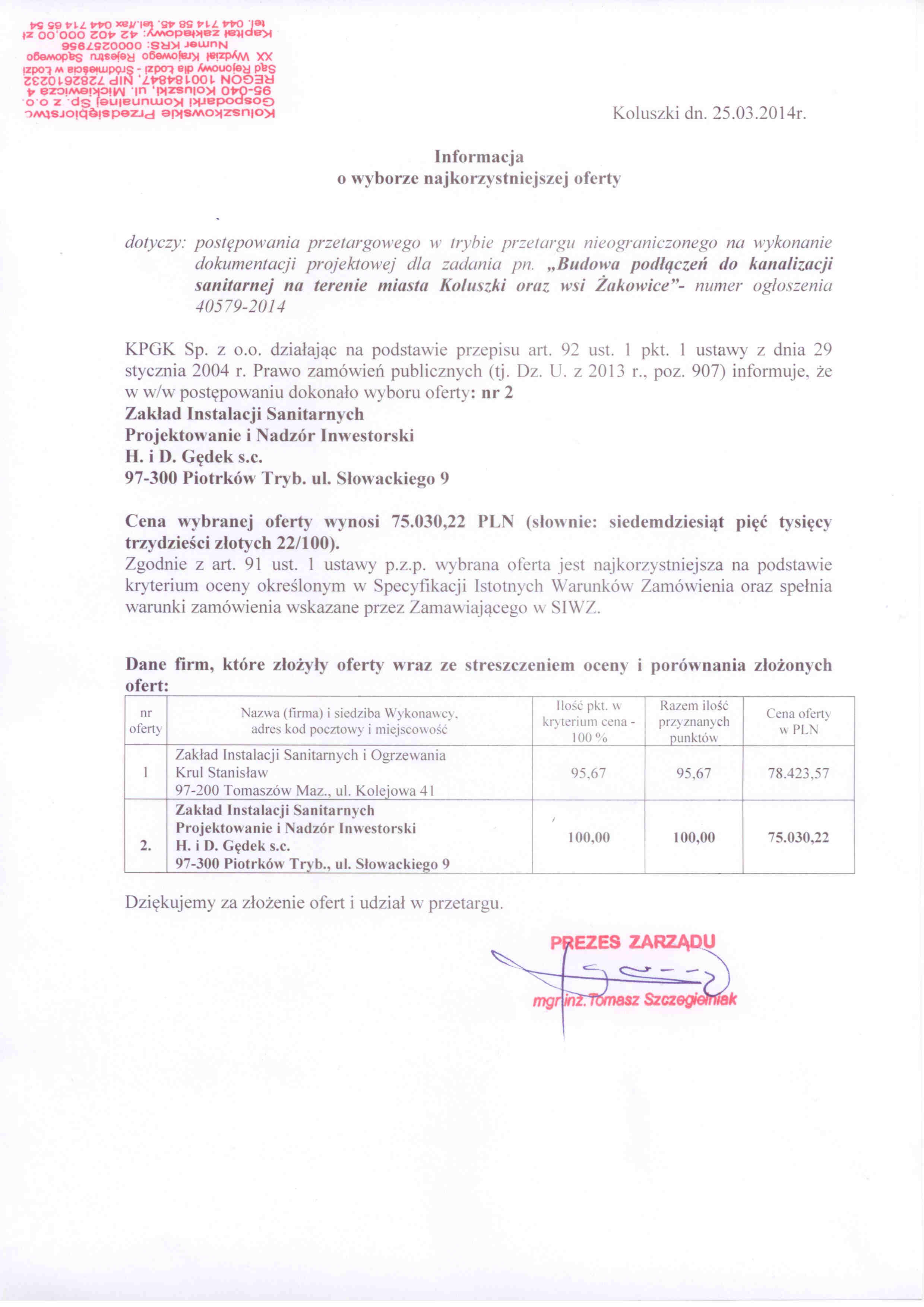 IV.4.4) Termin sk艂adania wniosk贸w o dopuszczenie do udzia艂u w post臋powaniu lub ofert: 14.03.2014 godzina 12:00, miejsce: Koluszkowskie Przedsi臋biorstwo Gospodarki Komunalnej Sp. z o. o.