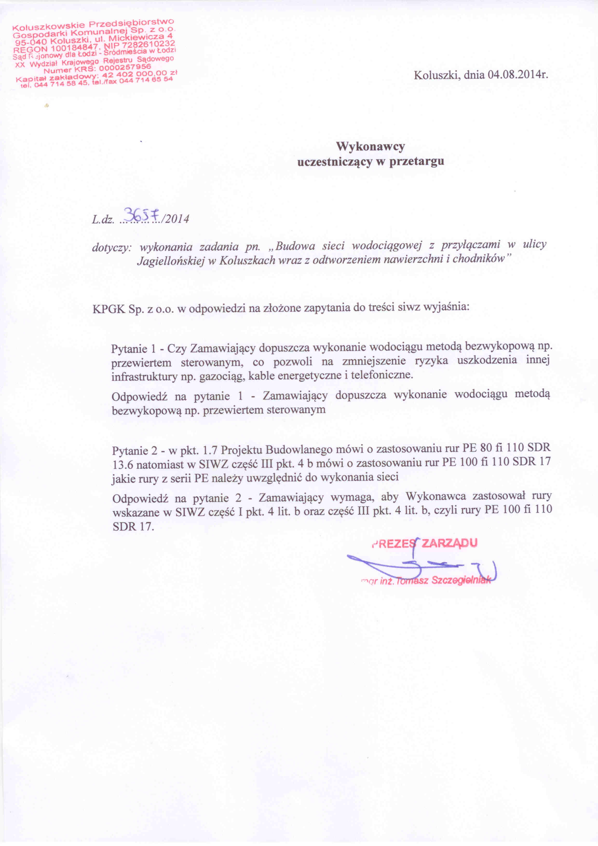 post臋powaniu lub ofert: 11.08.2014 godzina 12:00, miejsce: KPGK Sp. z o.o.