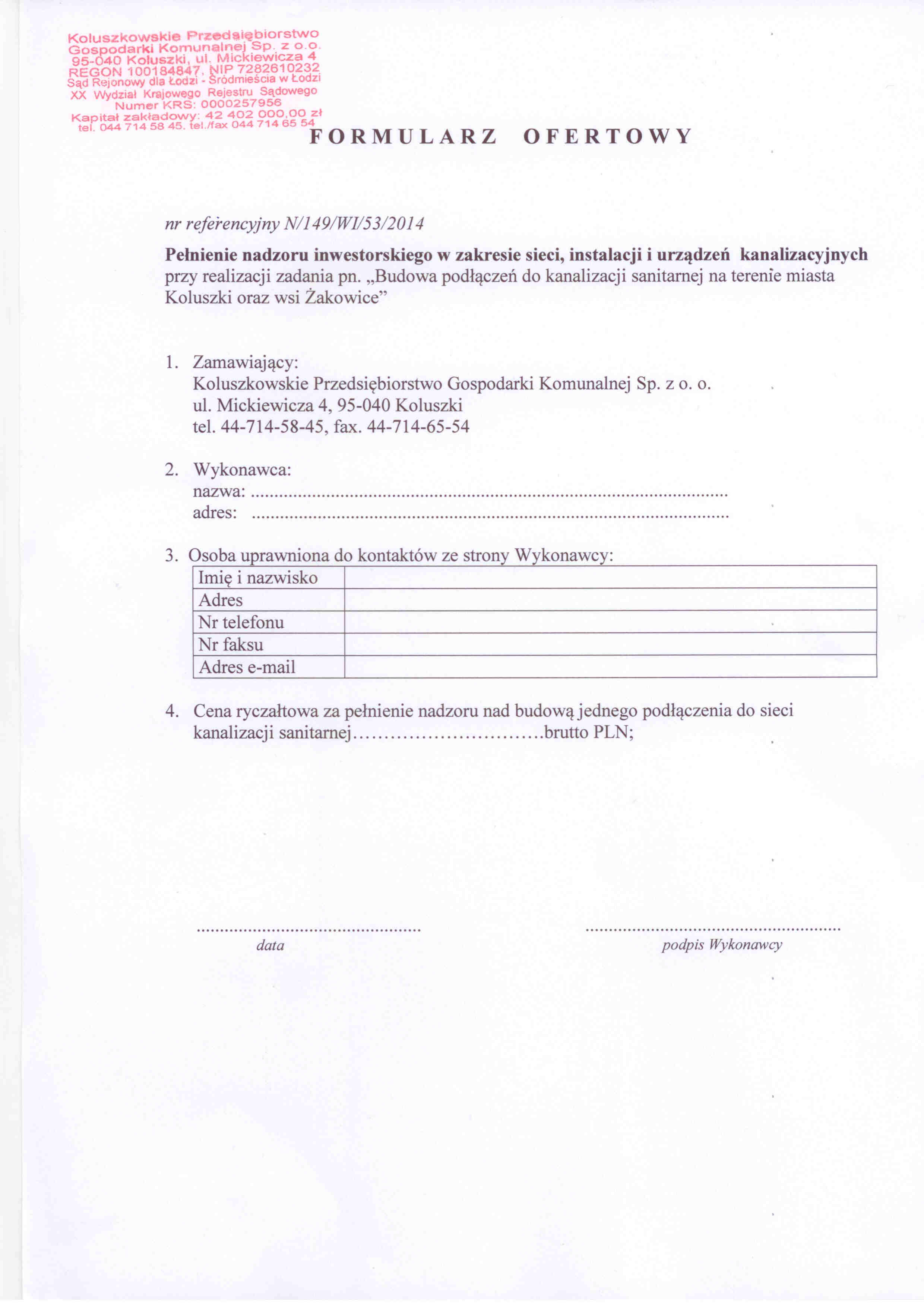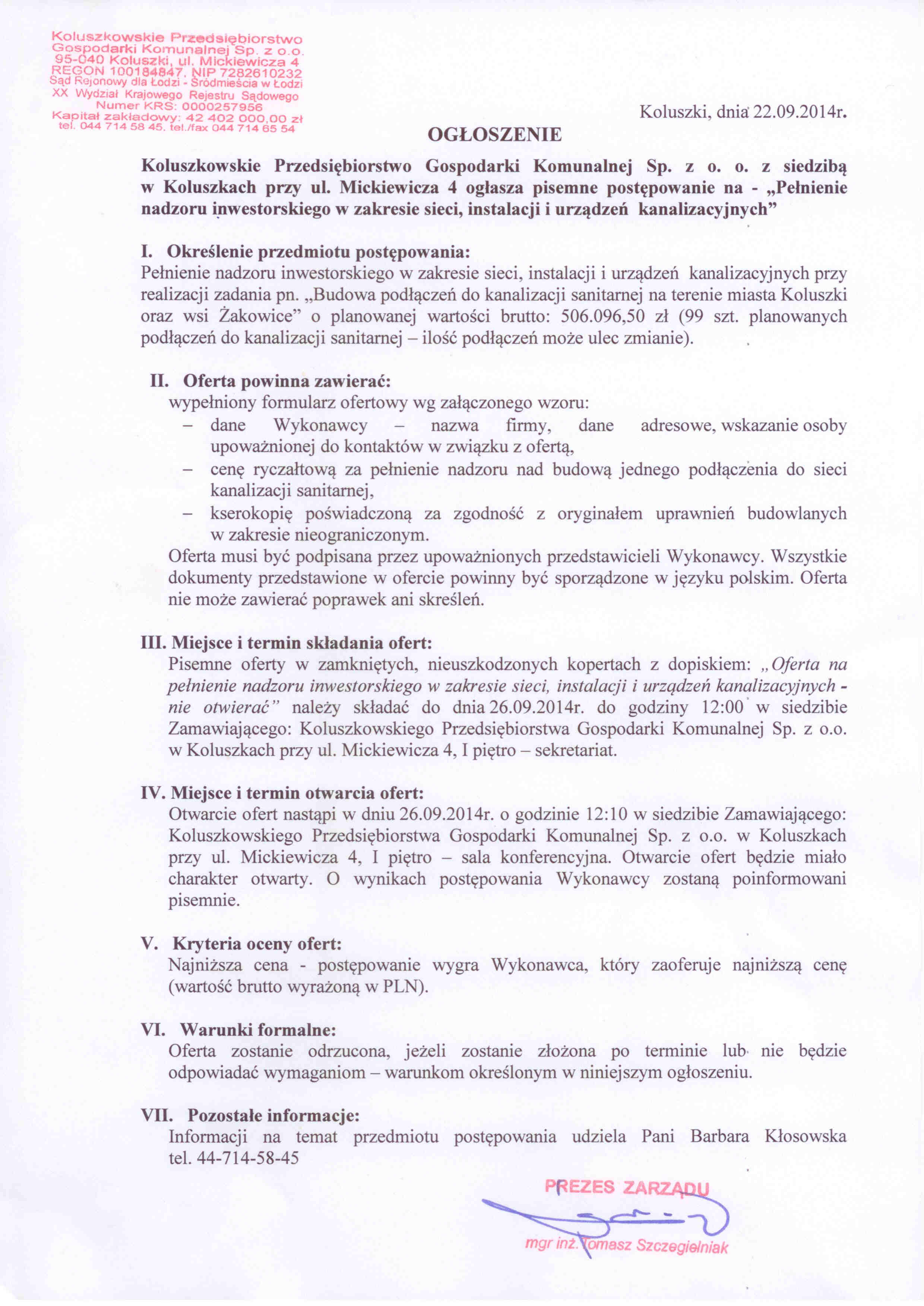 | Pe艂nienie nadzoru inwestorskiego w zakresie sieci, instalacji i urz膮dze艅 kanalizacyjnych |