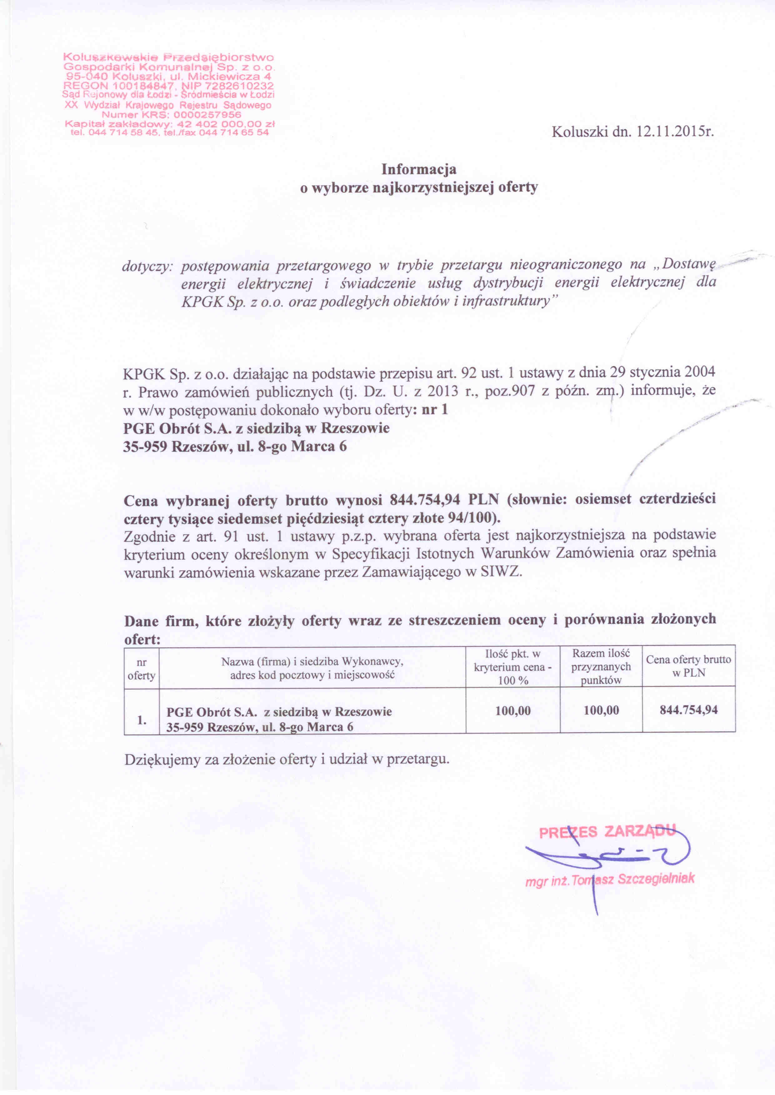 Dostawa energii elektrycznej i 艣wiadczenie us艂ug dystrybucji energii elektrycznej dla KPGK Sp. z o.o
