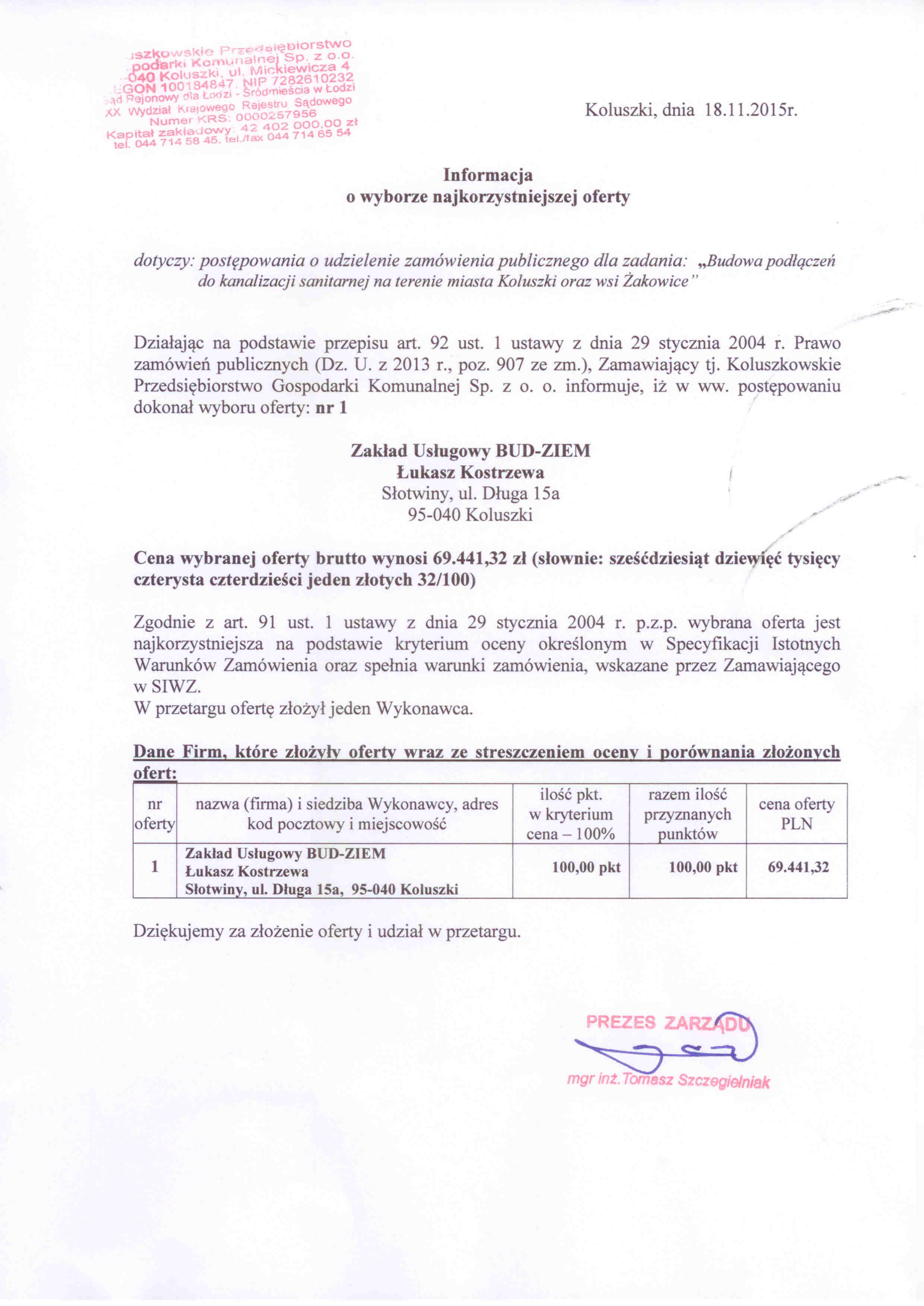 Koluszki: Budowa pod艂膮cze艅 do kanalizacji sanitarnej na terenie miasta Koluszki oraz wsi 呕akowice - 2015 Numer og艂oszenia: 292496 - 2015; data zamieszczenia: 30.10.2015 OG艁OSZENIE O ZAM脫WIENIU - roboty budowlane