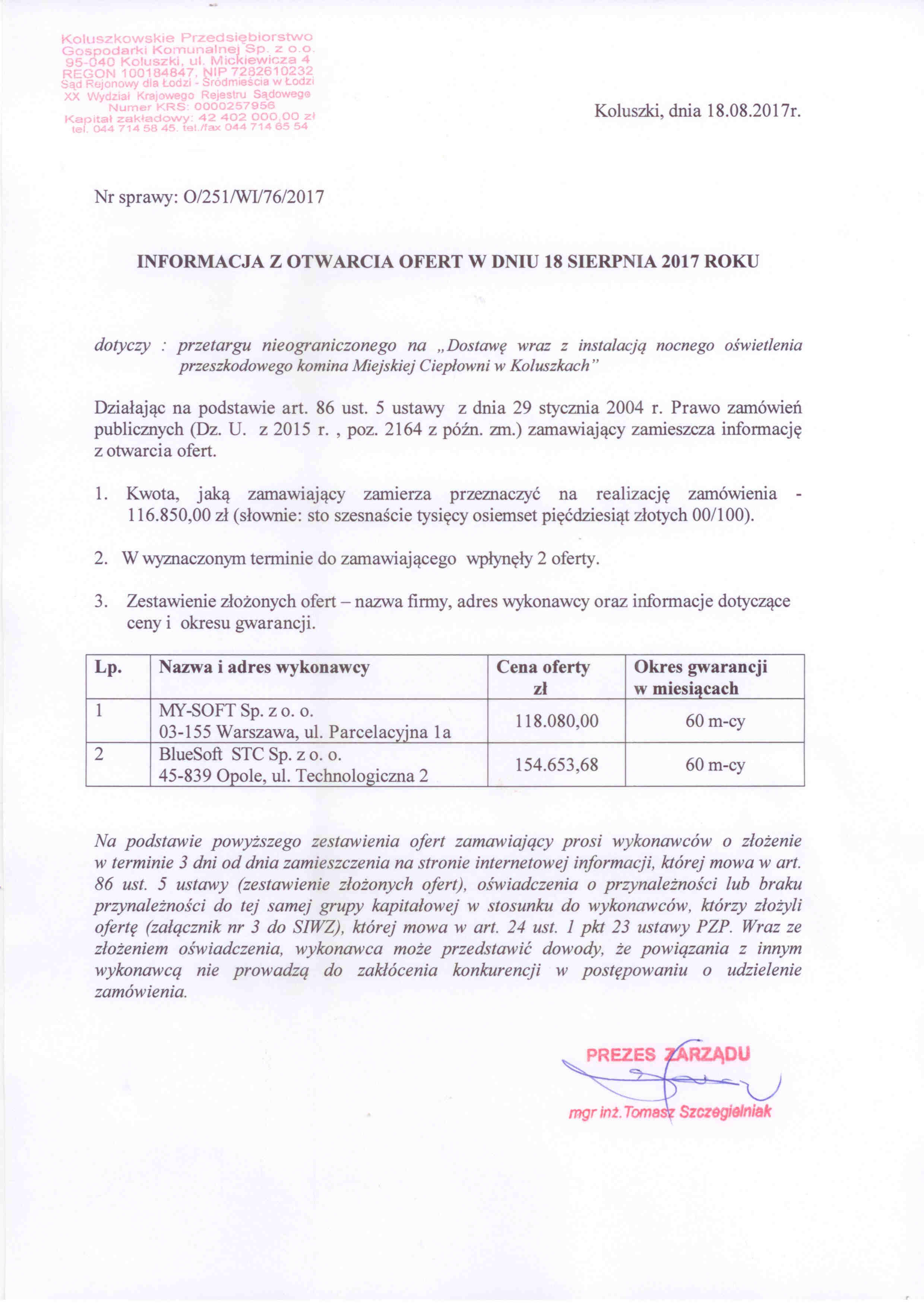 Koluszkowskie Przedsi臋biorstwo Gospodarki Komunalnej Sp. z o.o.: Dostawa wraz z instalacj膮 nocnego o艣wietlenia przeszkodowego komina Miejskiej Ciep艂owni w Koluszkach