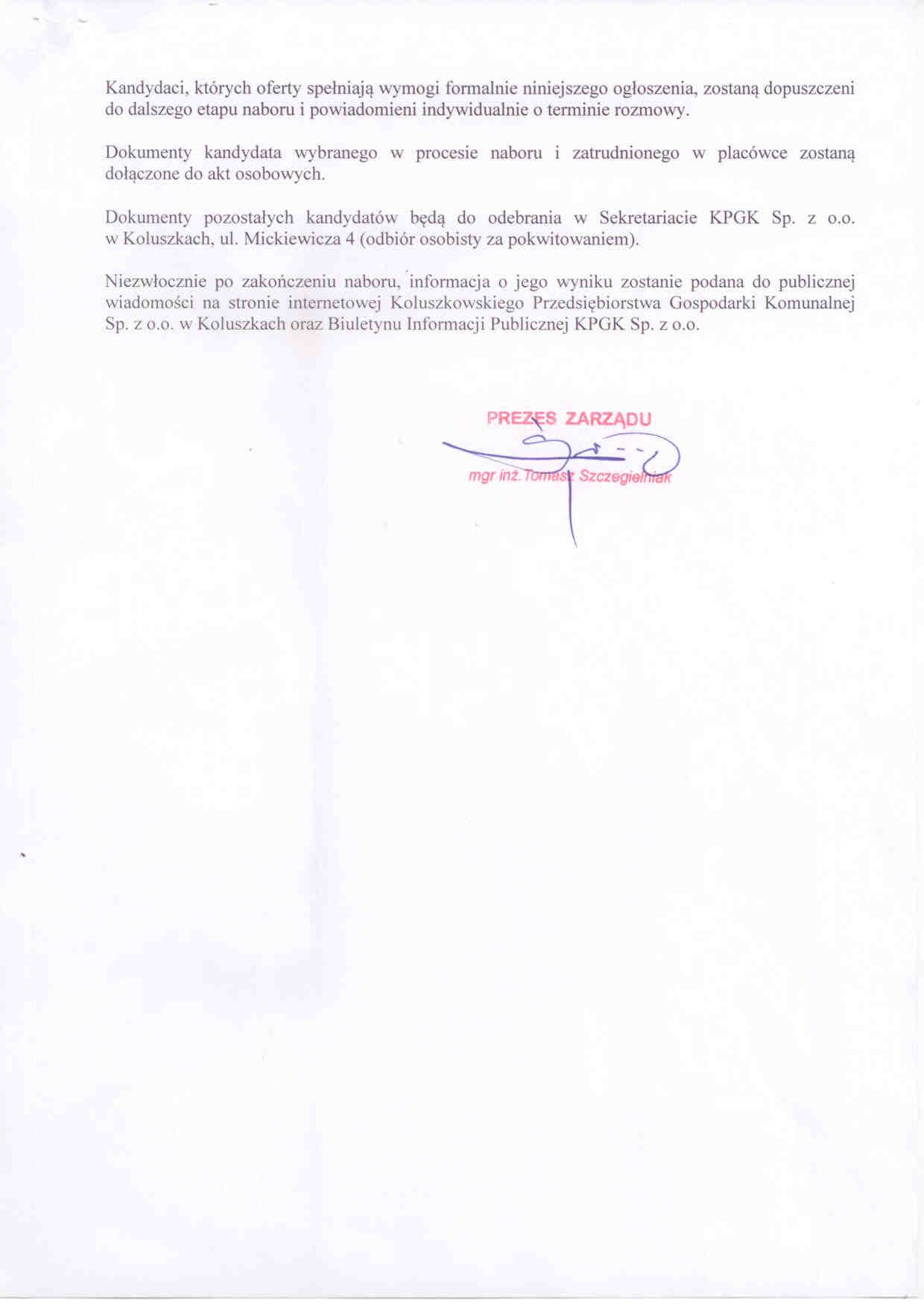 PREZES ZARZ膭DU KPGK Sp. z o.o. w Koluszkach, ul. Mickiewicza 4 og艂asza nabór