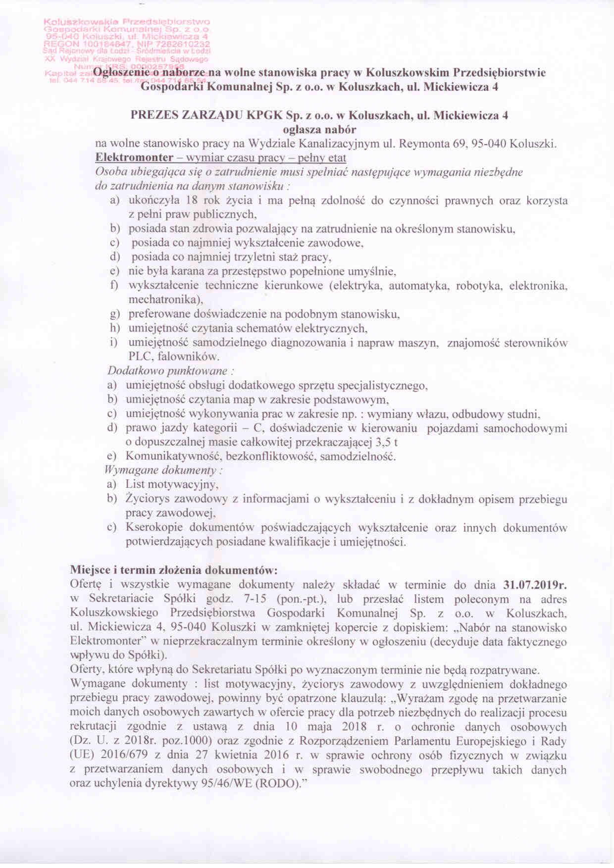 Og艂oszenie o naborze na wolne stanowiska pracy w Koluszkowskim Przedsi臋biorstwie Gospodarki Komunalnej Sp. z o.o. w Koluszkach, ul. Mickiewicza 4