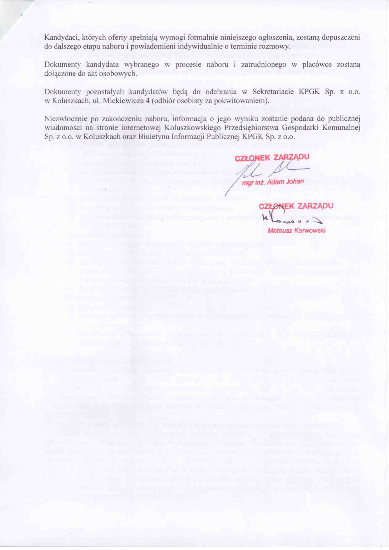PREZES ZARZ膭DU KPGK Sp. z o.o. w Koluszkach, ul. Mickiewicza 4 og艂asza nabór