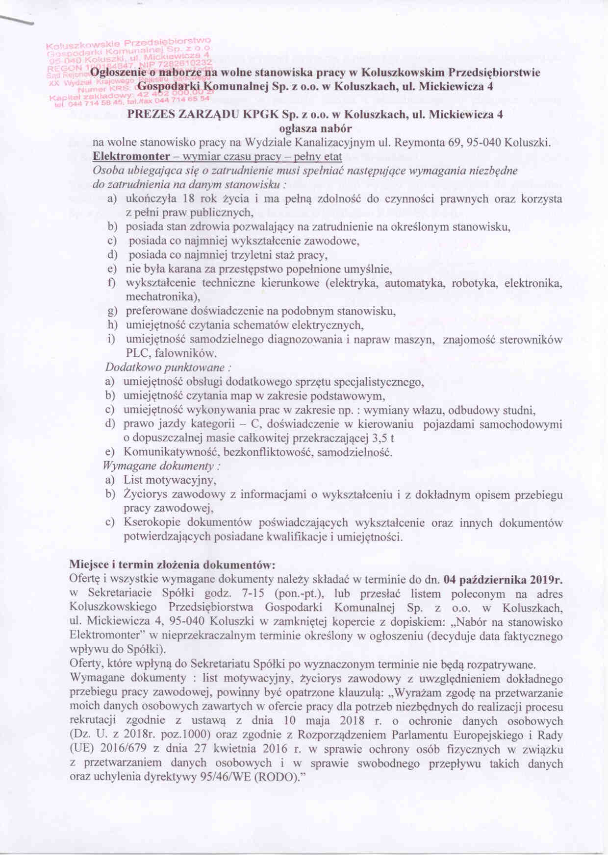 Og艂oszenie o naborze na wolne stanowiska pracy w Koluszkowskim Przedsi臋biorstwie Gospodarki Komunalnej Sp. z o.o. w Koluszkach, ul. Mickiewicza 4
