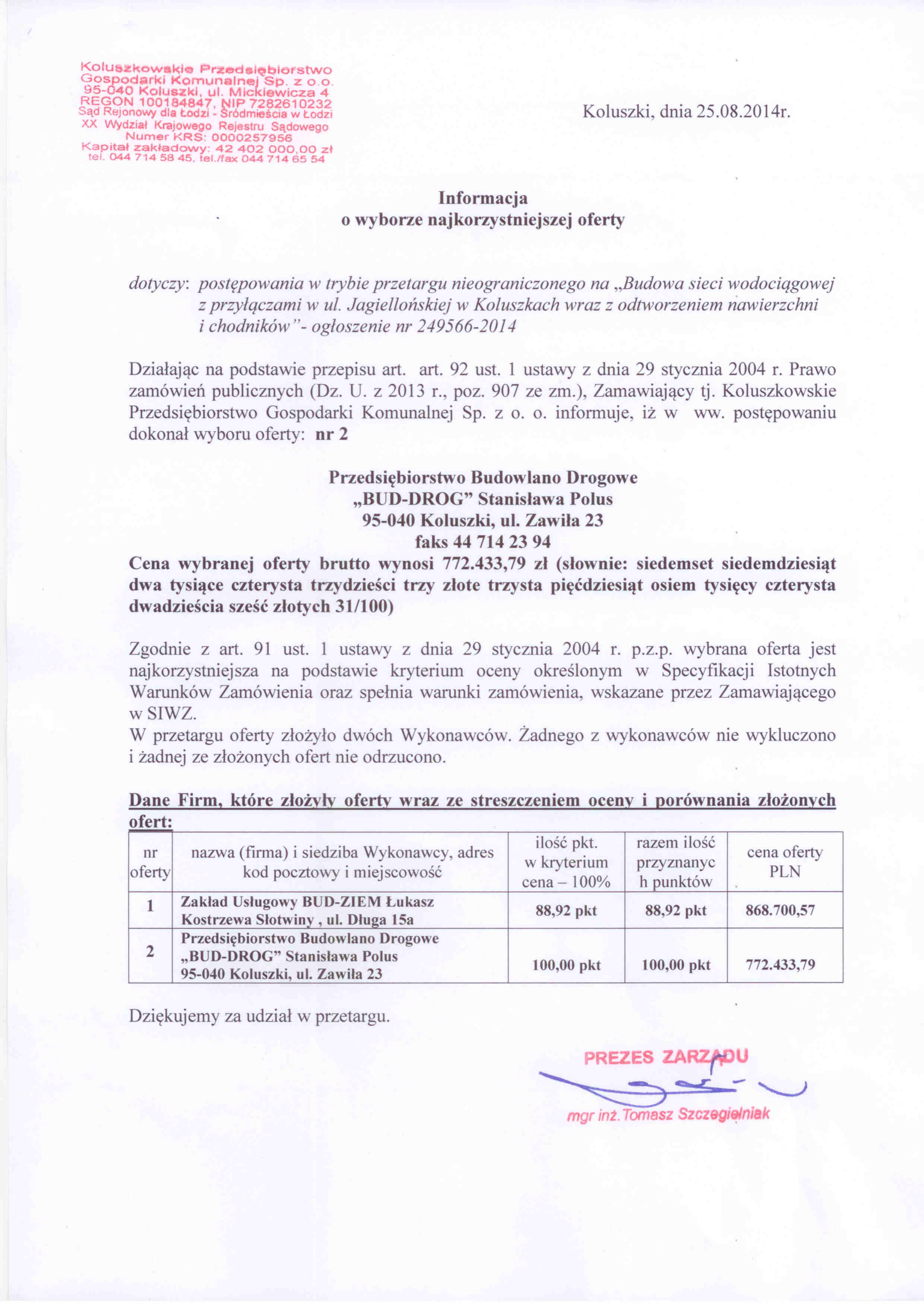 post臋powaniu lub ofert: 11.08.2014 godzina 12:00, miejsce: KPGK Sp. z o.o.