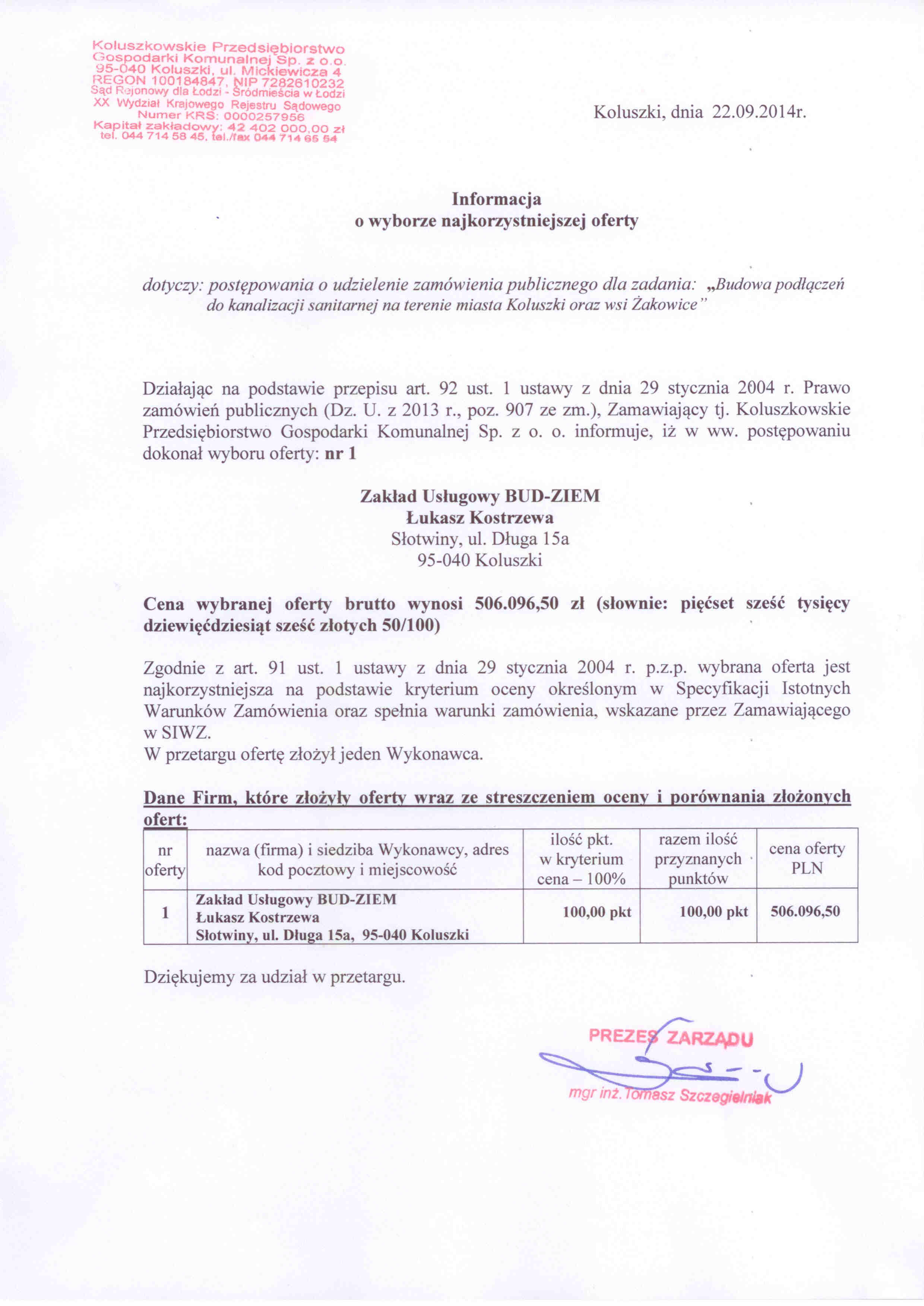 Zamieszczanie og艂oszenia: obowi膮zkowe. Og艂oszenie dotyczy: zam贸wienia publicznego. SEKCJA I: ZAMAWIAJ膭CY I. 1) NAZWA I ADRES: Koluszkowskie Przedsi臋biorstwo Gospodarki Komunalnej Sp. z o.o. , ul. Mickiewicza 4, 95-040 Koluszki, woj. 艂贸dzkie, tel. 044 7145845, faks 044 7146554. I. 2) RODZAJ ZAMAWIAJ膭CEGO: Inny: Sp贸艂ka prawa handlowego. SEKCJA II: PRZEDMIOT ZAM脫WIENIA II.1) OKRE艢LENIE PRZEDMIOTU ZAM脫WIENIA II.1.1) Nazwa nadana zam贸wieniu przez zamawiaj膮cego: Budowa pod艂膮cze艅 do kanalizacji sanitarnej na terenie miasta Koluszki oraz wsi 呕akowice. II.1.2) Rodzaj zam贸wienia: roboty budowlane. II.1.4) Okre艣lenie przedmiotu oraz wielko艣ci lub zakresu zam贸wienia: Przedmiotem zam贸wienia jest: Budowa pod艂膮cze艅 do kanalizacji sanitarnej na terenie miasta Koluszki oraz wsi 呕akowice, w tym: a. opracowanie harmonogramu realizacji rob贸t uwzgl臋dniaj膮cego najkr贸tsze przerwy w pracy sieci; b. wybudowanie pod艂膮cze艅 do kanalizacji sanitarnej na terenie miasta Koluszki oraz wsi 呕akowice w ilo艣ci 100 szt. zgodnie z projektem budowlanym; c. wbudowanie materia艂贸w budowlanych i armatury fabrycznie nowej, kt贸ra posiada Aprobaty Techniczne; d. wykonanie obs艂ugi geodezyjnej w zakresie tyczenia i inwentaryzacji geodezyjnej powykonawczej; e. bezwzgl臋dne uzyskanie zezwolenia od w艂a艣ciwego zarz膮dcy drogi na zaj臋cie pasa drogowego na czas realizacji budowy; f. wymieniana gruntu oraz wykonanie zag臋szczenia gruntu; g. przeprowadzenie prac drogowych w zakresie odtworzenia nawierzchni; h. uporz膮dkowanie terenu budowy i przekazanie Zamawiaj膮cemu terenu budowy; Liczba pod艂膮cze艅 mo偶e ulec zmianie w przypadku rezygnacji uczestnika programu Pod艂膮czenie ze wsparciem.. II.1.5) przewiduje si臋 udzielenie zam贸wie艅 uzupe艂niaj膮cych: - Okre艣lenie przedmiotu oraz wielko艣ci lub zakresu zam贸wie艅 uzupe艂niaj膮cych