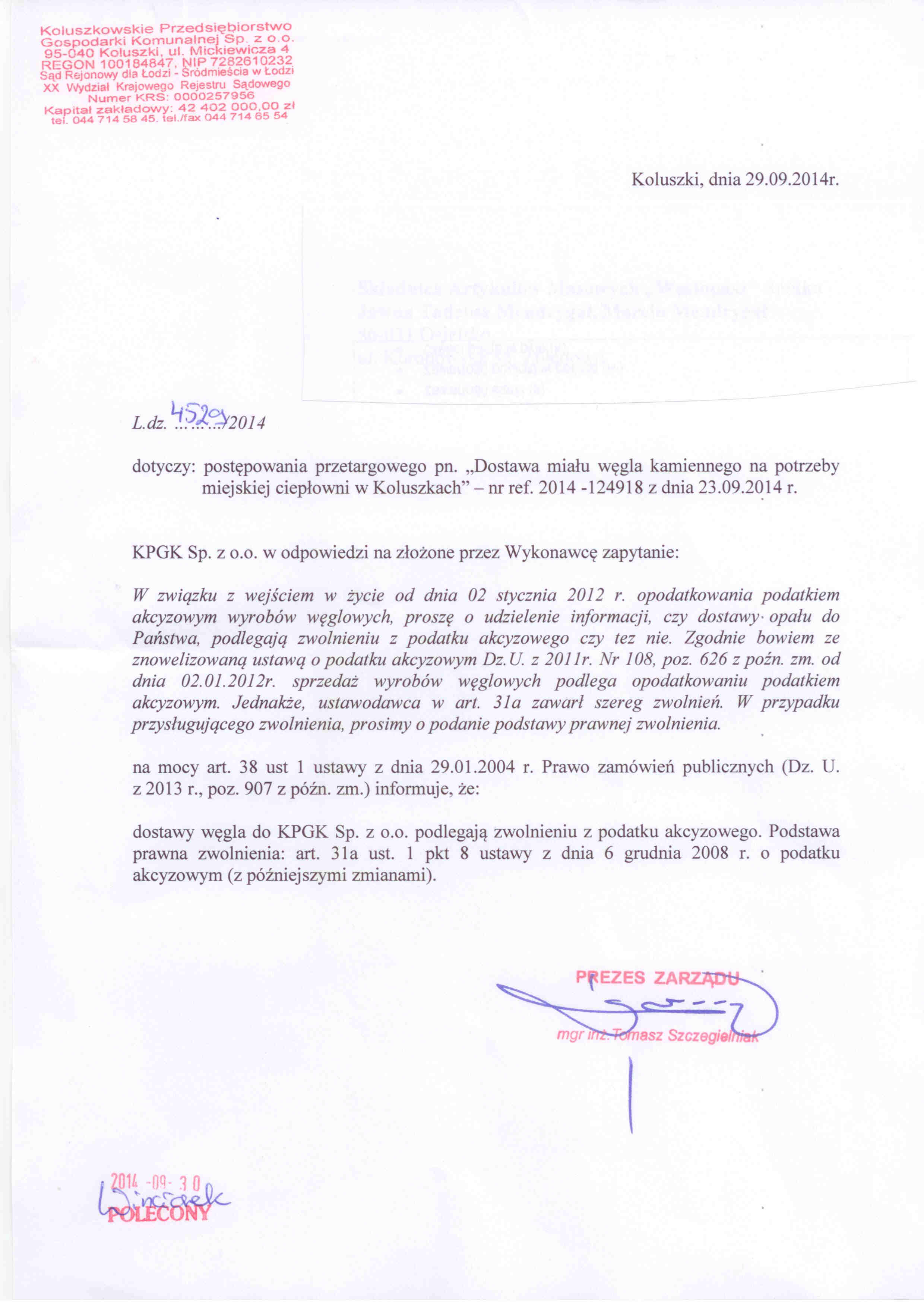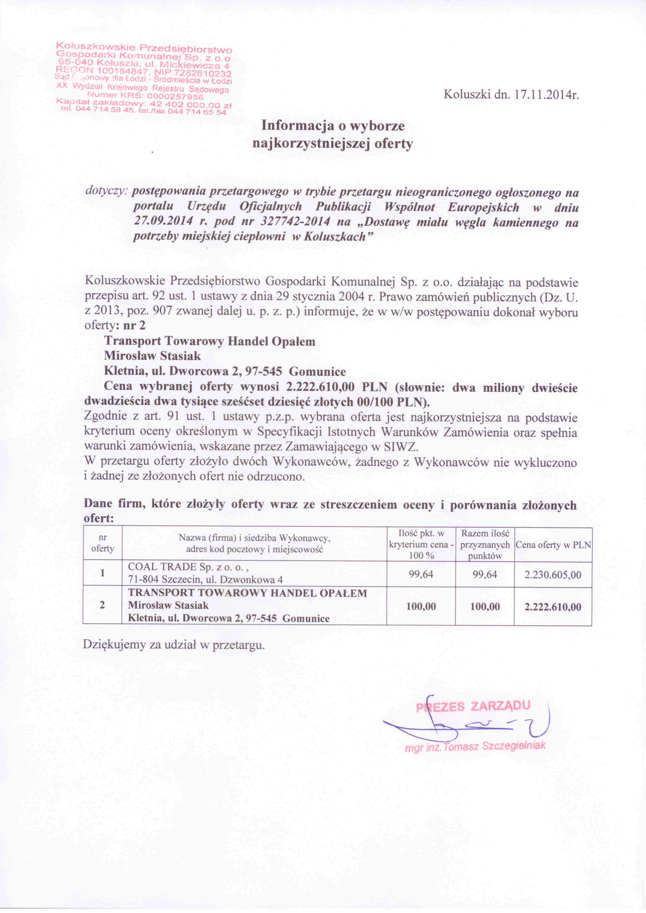 | Dostawa mia艂u w臋gla kamiennego na potrzeby ciep艂owni miejskiej w Koluszkach |