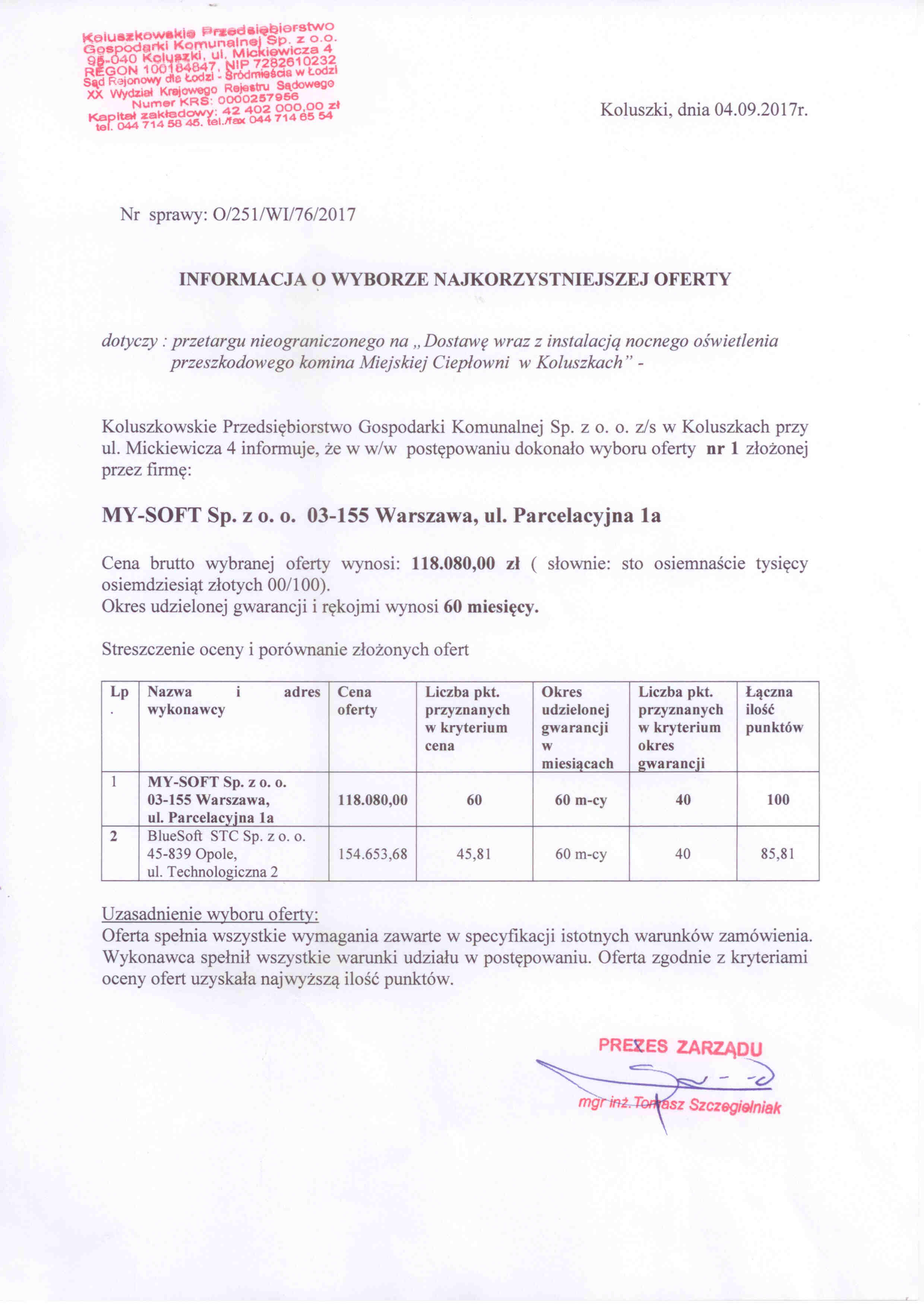 Koluszkowskie Przedsi臋biorstwo Gospodarki Komunalnej Sp. z o.o.: Dostawa wraz z instalacj膮 nocnego o艣wietlenia przeszkodowego komina Miejskiej Ciep艂owni w Koluszkach