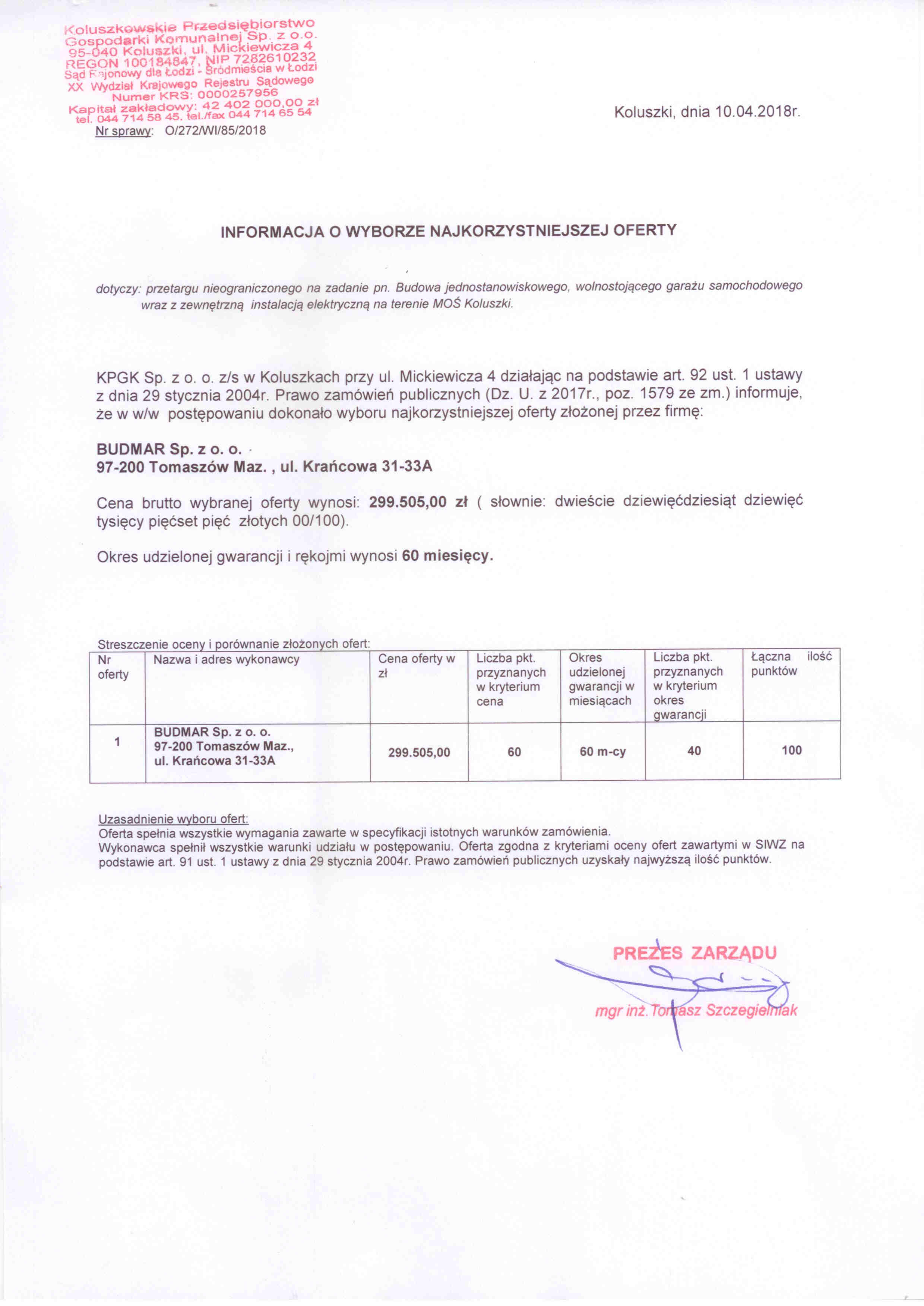 | Typ | Rozmiar | Pobierz | Komentarz | Data dodania | Licznik | ? | 107.8 KB | POBIERZ | OG艁OSZENIE O ZAM脫WIENIU | 2018-03-08 14:16:32 | 404 | ? | 344.5 KB | POBIERZ | SIWZ | 2018-03-08 14:16:51 | 283 | .ZIP | 4992.6 KB | POBIERZ | Za艂膮czniki 1 | 2018-03-08 14:17:52 | 308 | .ZIP | 7564.8 KB | POBIERZ | Za艂膮czniki 2 | 2018-03-08 14:19:21 | 315 | graf. | 327.2 KB | POBIERZ | Informacja z otwarcia ofert | 2018-03-29 10:43:00 | 269 | graf. | 356.9 KB | POBIERZ | Informacja o wyborze najkorzystniejszej oferty | 2018-04-13 07:19:58 | 275 |