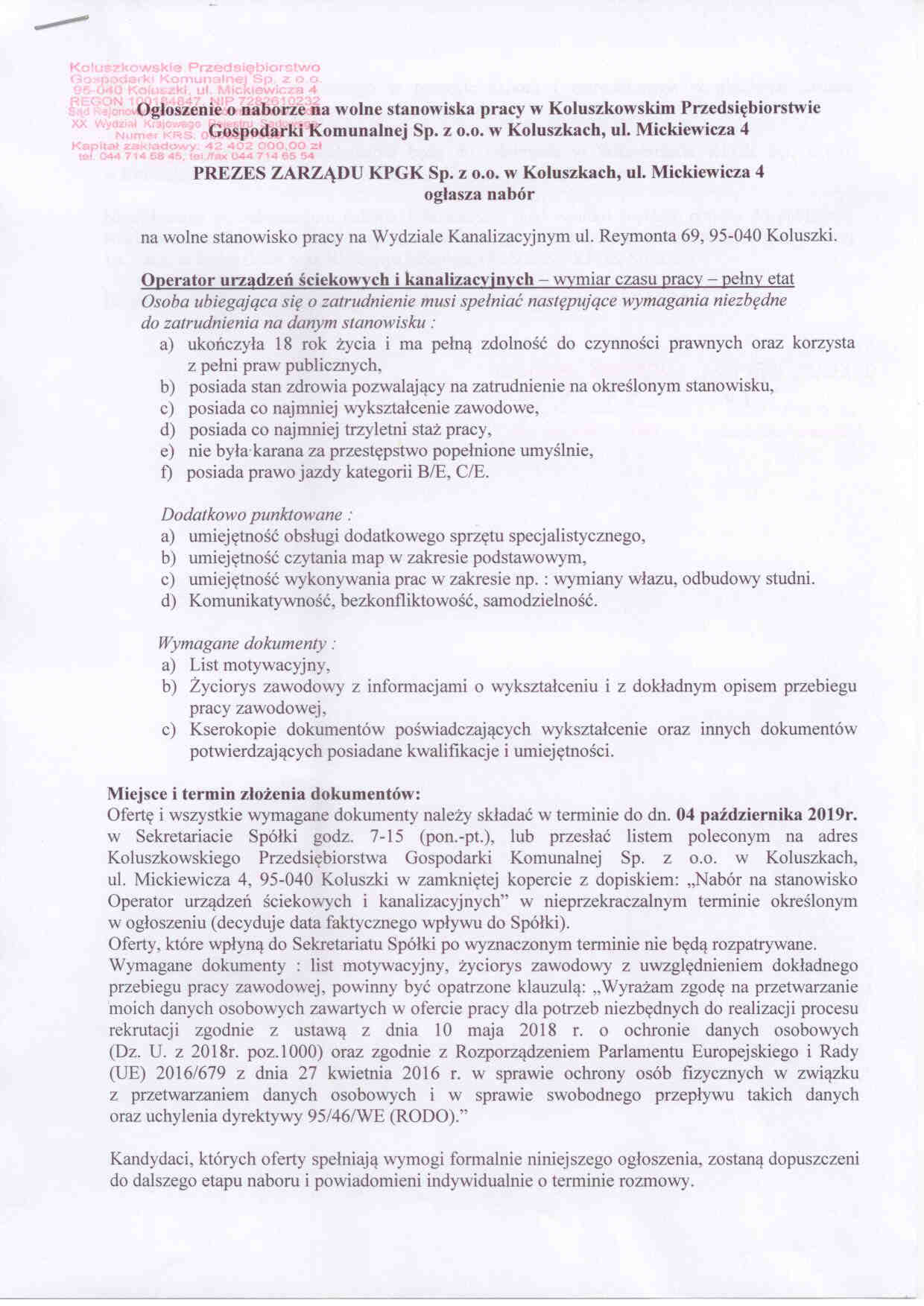Og艂oszenie o naborze na wolne stanowiska pracy w Koluszkowskim Przedsi臋biorstwie Gospodarki Komunalnej Sp. z o.o. w Koluszkach, ul. Mickiewicza 4