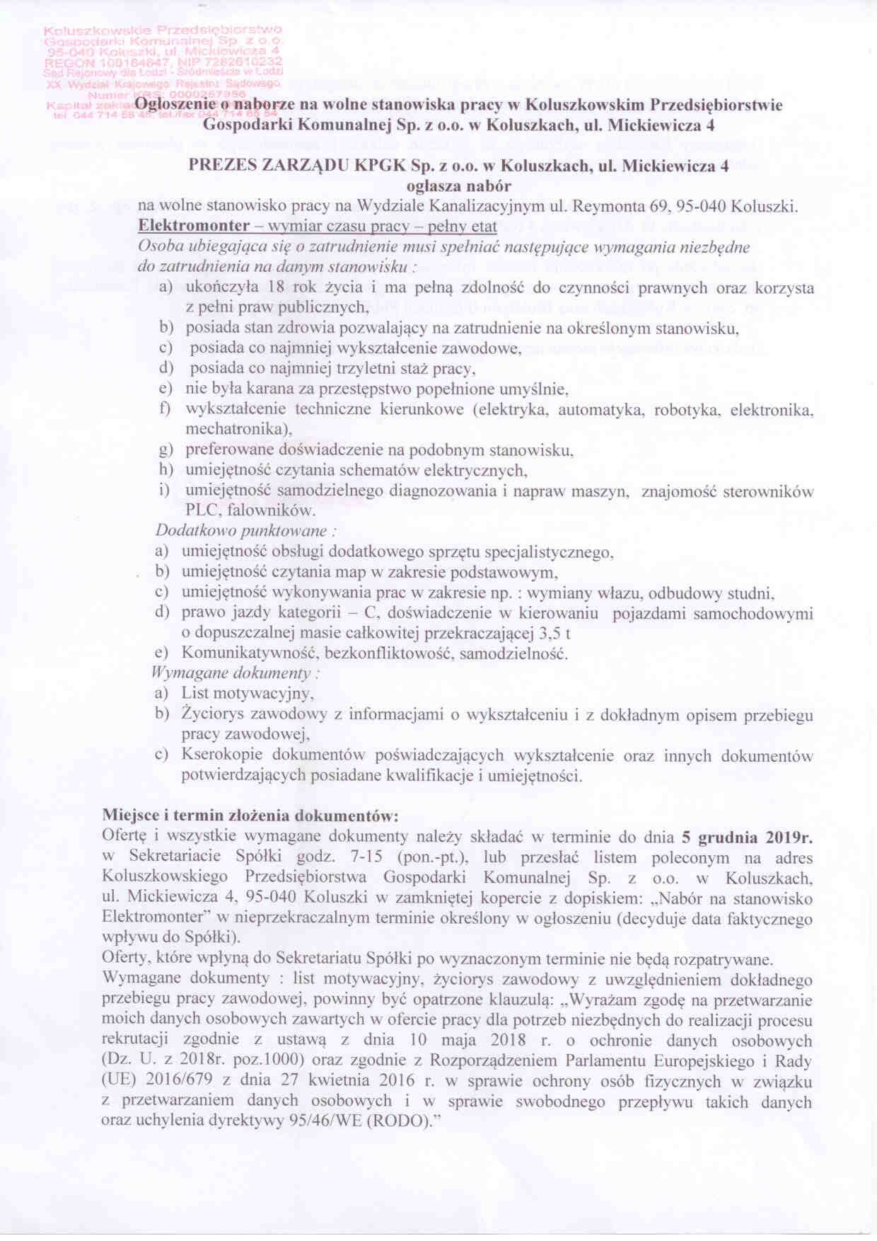 Og艂oszenie o naborze na wolne stanowiska pracy w Koluszkowskim Przedsi臋biorstwie Gospodarki Komunalnej Sp. z o.o. w Koluszkach, ul. Mickiewicza 4