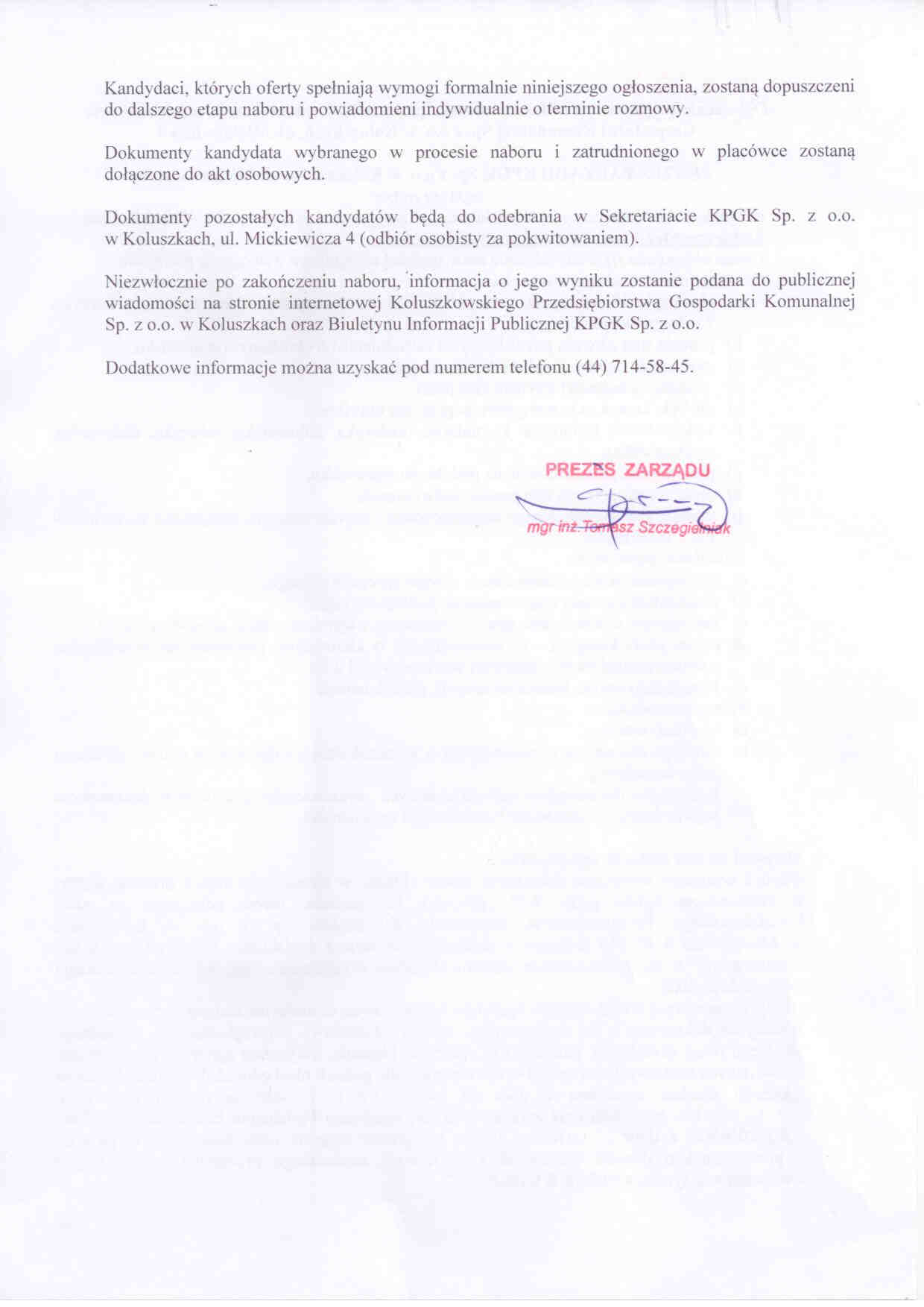 PREZES ZARZ膭DU KPGK Sp. z o.o. w Koluszkach, ul. Mickiewicza 4 og艂asza nabór